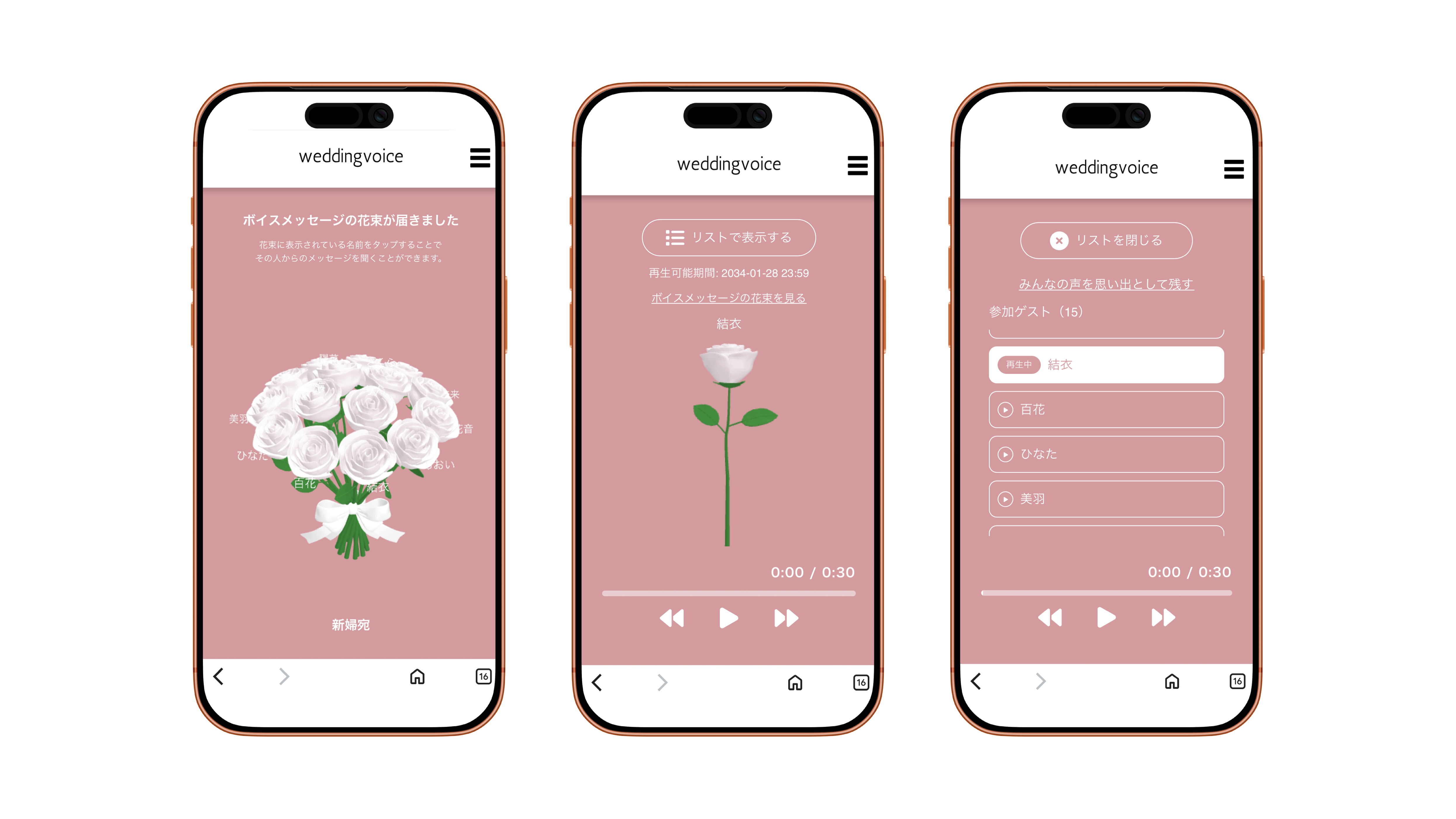 추억이 형태로 남기 때문에 결혼식 기념품으로 적합합니다. 신랑 신부가 직접 구매하시거나 가족이나 친구들이 목소리 선물로 구입하시는 경우에도 추천하는 상품입니다. MP3 플레이어에는 모든 하객의 보이스 메시지가 수록되어 있습니다.
